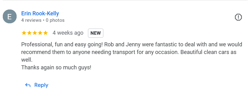 This month’s review is from Erin, who recently booked her Wedding Transport with us, provided by Chauffeur Guides Rob and Jenny. We’d like to thank Erin for entrusting Your Exclusive Tours with her wedding day and for leaving this lovely review.